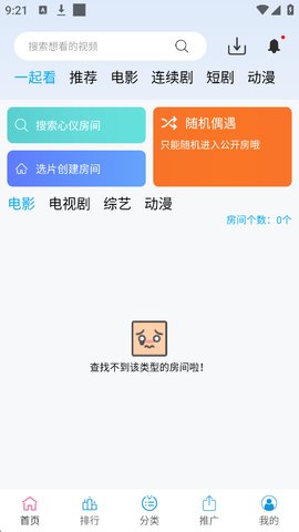 首页点击上方的一起看,你可以点击随机偶遇进行房间;也可以通过搜索心仪房间进入房间。