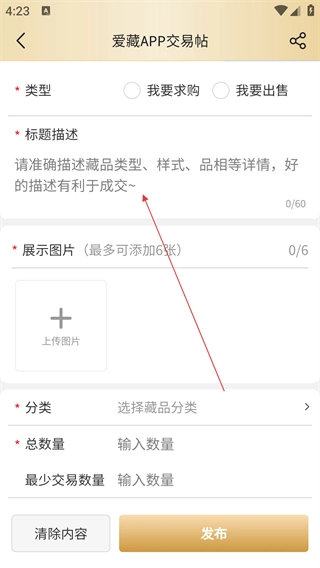 4、进入交易帖的编辑界面后,第一步要选定帖子类型(求购或出售),接着填写标题与描述内容,再上传用于展示的图片。