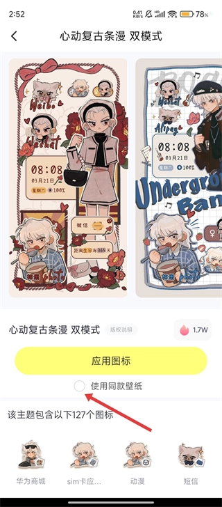 3、进入【心动复古条漫-双模式】的详情页面后,还可以勾选【使用同款壁纸】这个选项哦。