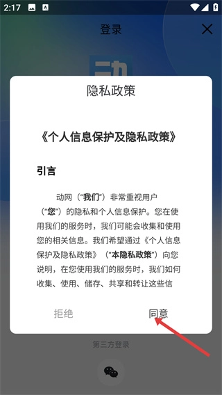 1在登录页的隐私政策弹窗里点击【同意】按钮,确认接受《个人信息保护及隐私政策》后,即可进入动网的登录页面。