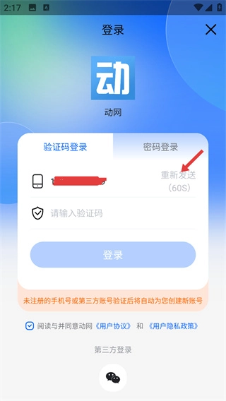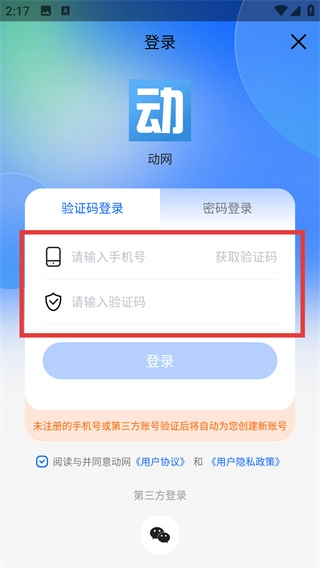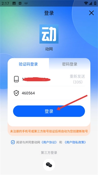4、在验证码登录页面输入收到的验证码后,点击蓝色的【登录】按钮,即可完成动网账号的注册登录流程。