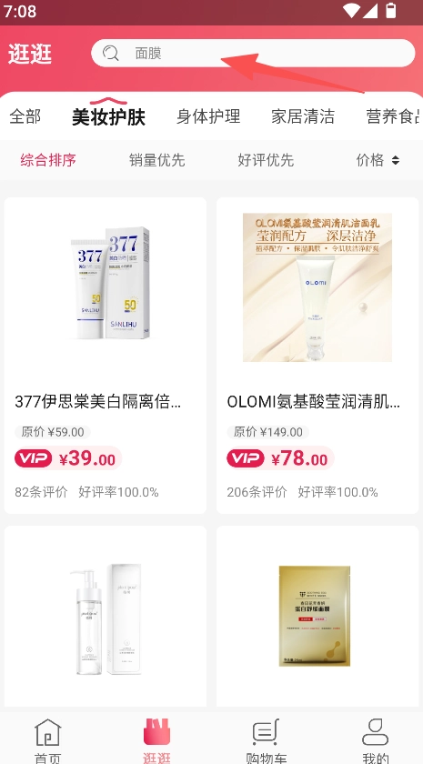 1、支持分类浏览,点击美妆护肤、身体护理等分类后,可选择排序方式,浏览相应商品列表,从而完成商品的筛选与查找。