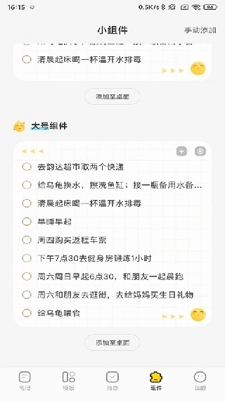 1打开指尖笔记应用,找到组件功能入口,挑选心仪的组件样式,确认后选择添加到手机桌面即可完成操作。