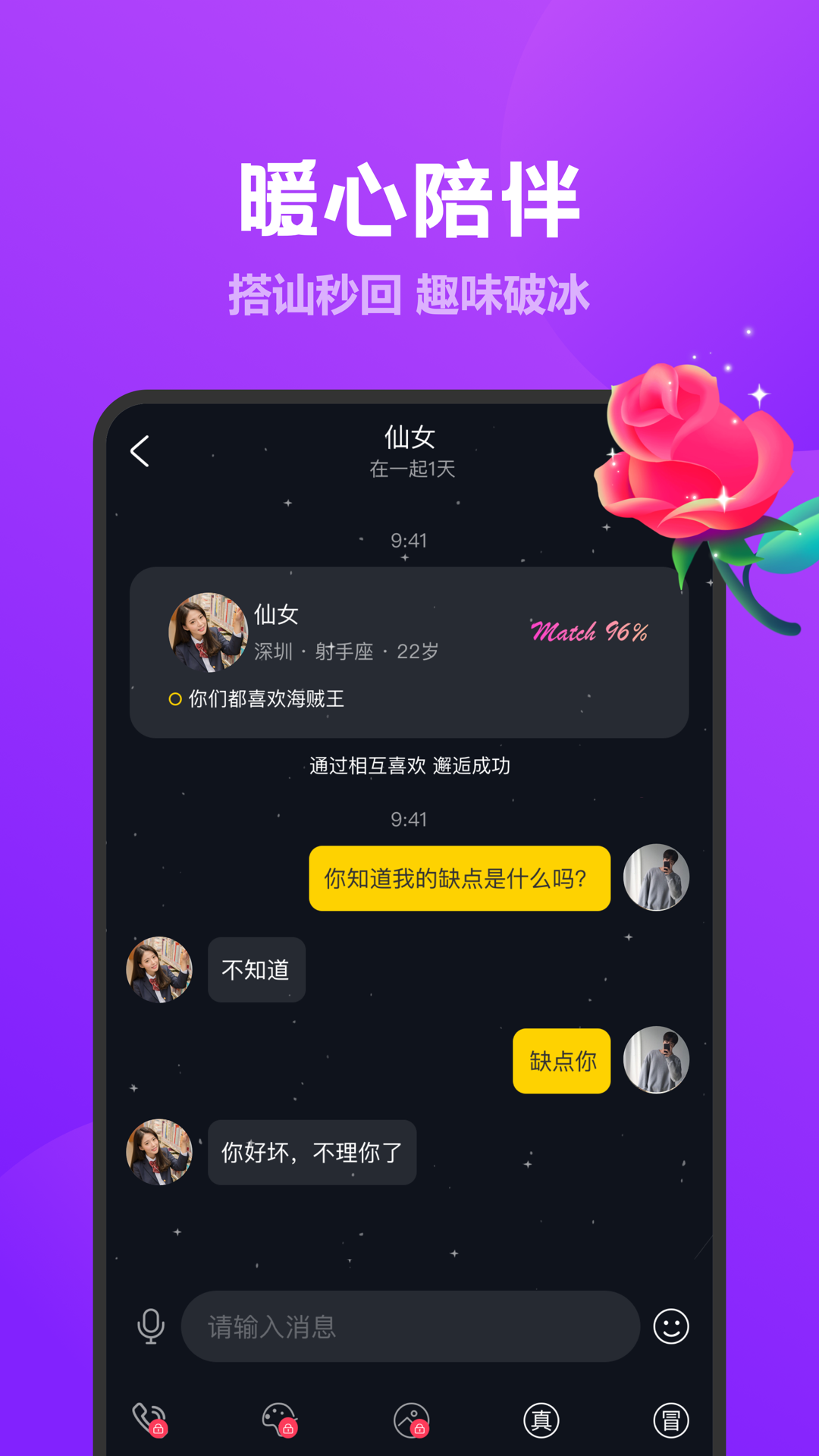 实时语音匹配:系统会根据你的兴趣标签,为你实时匹配一位聊伴,进行一对一的限时语音畅聊。合拍则继续,不合拍无负担,高效结识投缘的朋友。