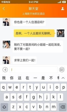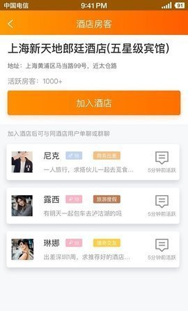 3. 进入自己感兴趣的【酒店聊天室】,参与酒店群聊,联系同酒店的其他人;