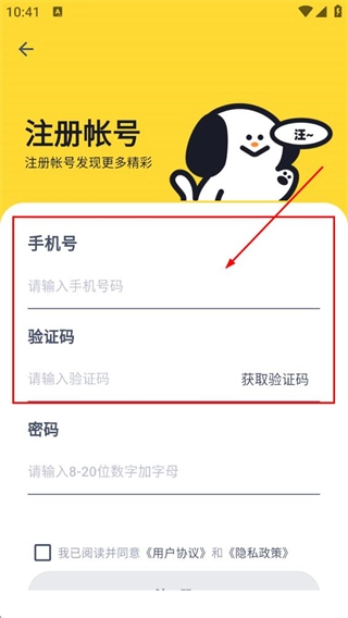 4、在注册帐号页面,输入手机号码,点击获取验证码后,填写收到的验证码。