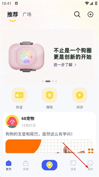 1、在宠物类首页,点击底部导航栏的我的,进入个人页面。