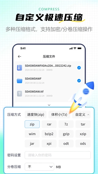 超过40种压缩格式支持,除ZIP、7Z、RAR常见格式外,还支持和兼容ISO、DMG、CAB、TAR等压缩格式。