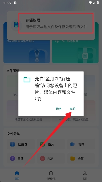2、首次使用请授予软件部分手机权限,如存储权限。然后点击允许。