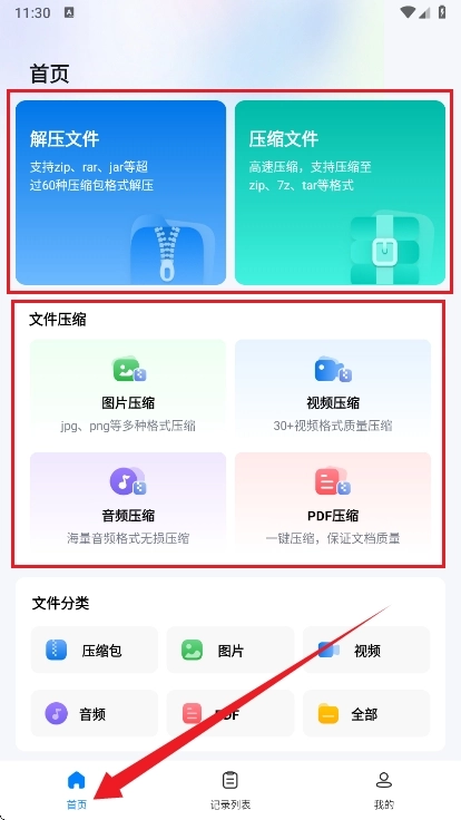 3、进入到软件首页,这里我们可以看到各种功能。如解压文件、压缩文件等功能。