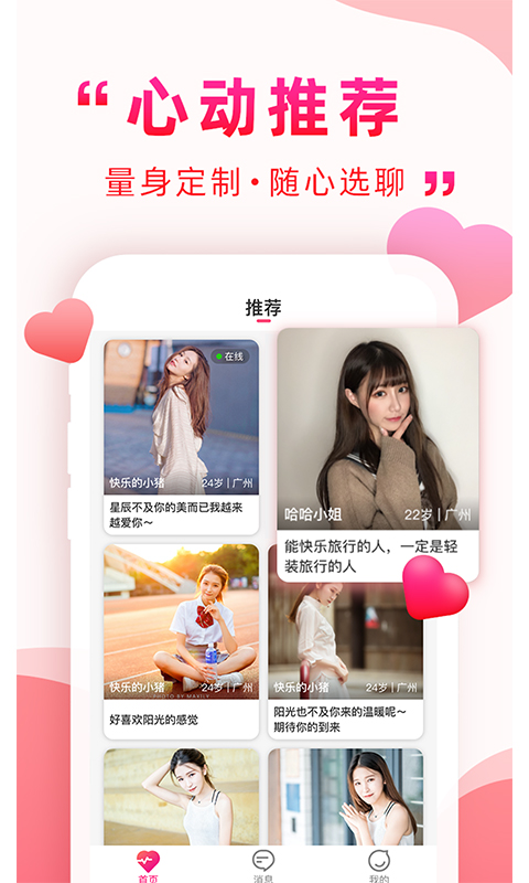 一笑倾城交友app官方版汇聚了来自全国各地的用户,每一用户都是经过平台真人审核的,提供的材料信息真实牢靠,大家可以放心的畅聊,并且这里的活跃度非常高,绝对不会出行已读不回的情况,还有语音、视频等多种社交模式可以自由选择,感兴趣的朋友快来下载体验吧!