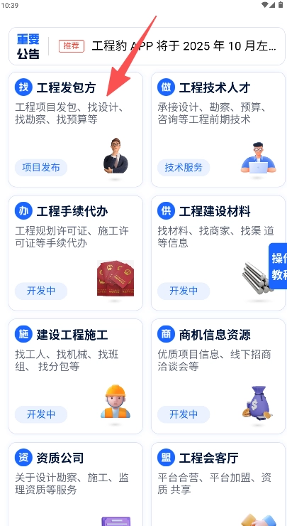 2、在首页浏览功能图标,点击“找工程发包方”进入页面。