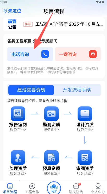 3、在项目流程页面查看服务企业列表,点击“电话咨询”进行咨询。