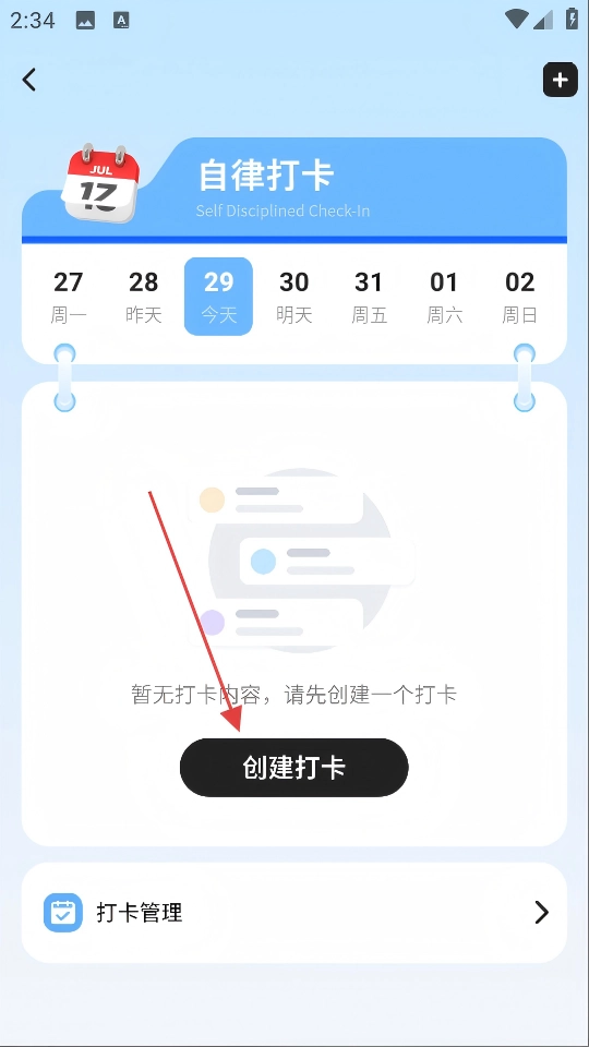 2、在【自律打卡】页面,点击【创建打卡】按钮,进入添加打卡页面。