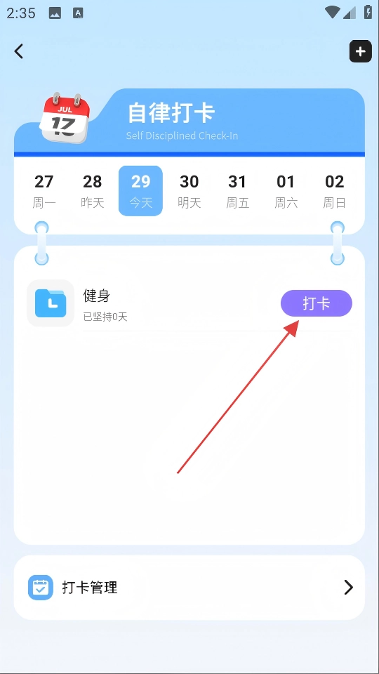 4、回到【自律打卡】页面,点击已创建打卡项旁的【打卡】按钮,即可完成当日自律打卡操作。