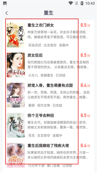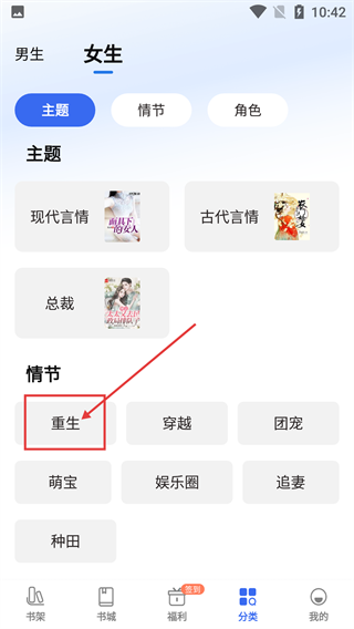 2、进入分类页面后,在【女生】分类下的【情节】板块,如选择【重生】标签,进入重生类小说列表页面。