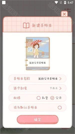 3、新建手账的时候也可以为自己的手账设置名称、封皮、权限以及是否为默认手账,点击确定即可新建手账