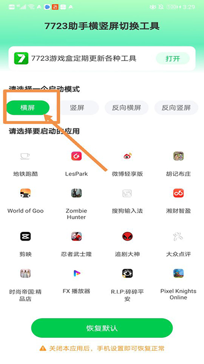1完成安装后直接打开应用,先在模式选项中选定【横屏】,再选择要启动的目标应用即可完成设置。