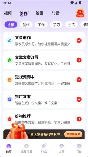 2、在创作页面,平台为用户提供了丰富的热门创作服务,涵盖文章创作、推广文案、小说创作等多种类型。