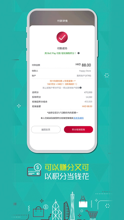 2消费或缴费都能累积积分,积分可直接抵扣消费金额,最低1港元即可使用;通过BoC Pay平台,积分能即时兑换电子礼券并存储,使用方便快捷;此外还有新用户开户奖励及各类合作商户的专属优惠活动。