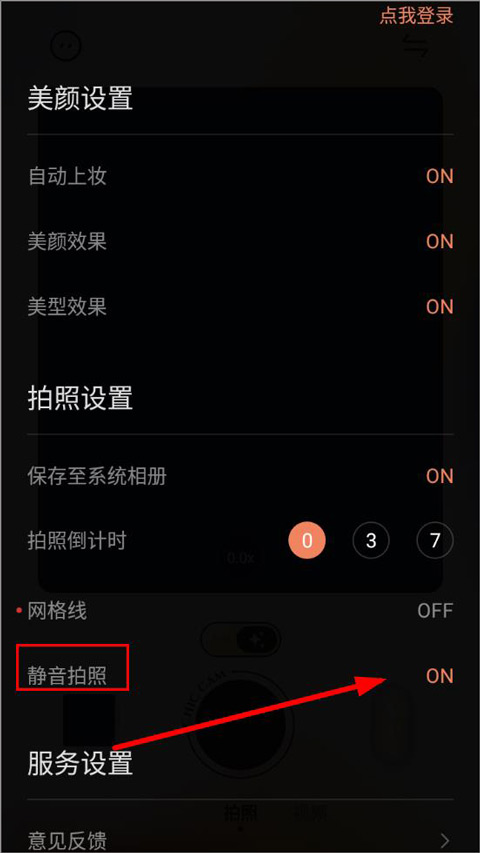 3进入设置界面后,能找到美颜相关、拍摄相关、服务相关等功能板块,在拍摄相关设置里开启静音拍摄功能就完成了。