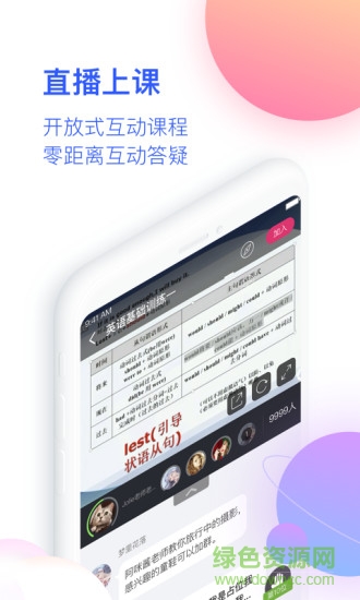 cctalk校园版是专为学校打造的教学管理软件,具备丰富实用的功能模块。支持开放式直播授课,师生可在课堂上零距离互动,轻松解答疑问;还能离线缓存课程内容,让你随时随地观看无需消耗流量。欢迎前往绿色资源网体验!