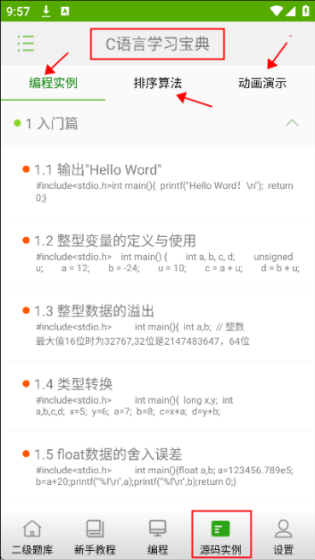3、学习编程的用户可点击源码实例页面进行系统化编程课程学习,还能观看动画演示以加深对学习内容的理解。