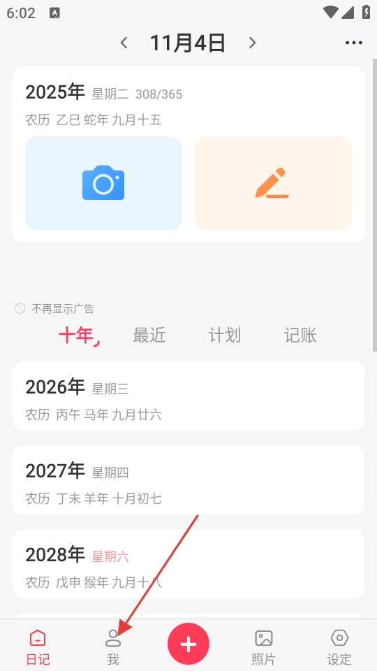 1、在日记页面,点击底部【我】选项,可进入个人中心界面。