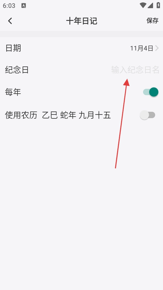 4、在编辑界面,输入纪念日名称,设置日期、是否每年提醒等信息后点击【保存】,可添加新的纪念日。