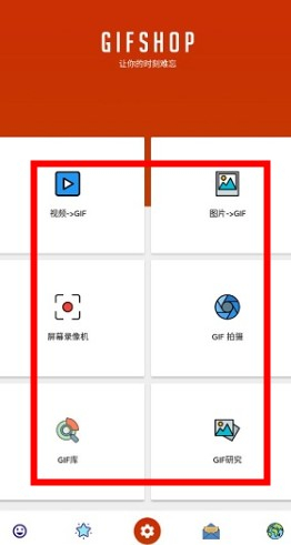 启动GIFShop应用后,界面会呈现六大核心功能模块,包含视频与图片格式转换为GIF、GIF动态拍摄、屏幕内容录制、GIF素材库以及GIF技术研究等选项,能够便捷满足各类使用场景的需求。