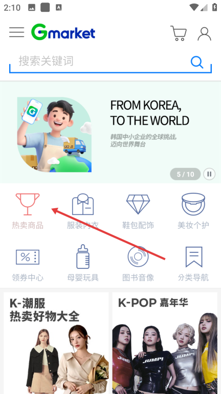 2在Gmarket的主页找到并点击“热卖商品”入口,即可跳转至热卖商品的分类展示页面。
