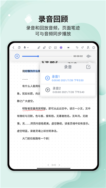 在进行录音操作的同时,你能够同步进行书写;当播放这段录音时,只需点击页面上书写过程中留下的任意一笔画,就能触发对应笔画书写时刻所录制的音频内容进行播放。