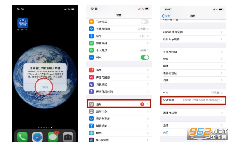 完成后点击图标,若弹出“未受信任的企业级开发者”提示,需进入设置-通用-设备管理页面,选择信任“Harbin Institute of Technology”即可。