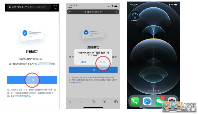 这款面向校内师生的应用并未在苹果官方应用商店上线。完成注册流程后,用户需点击注册成功页面的对应按钮,在系统弹出的确认窗口中选择安装选项,随后返回手机主屏幕,即可看到该应用已完成安装并显示在应用列表中。