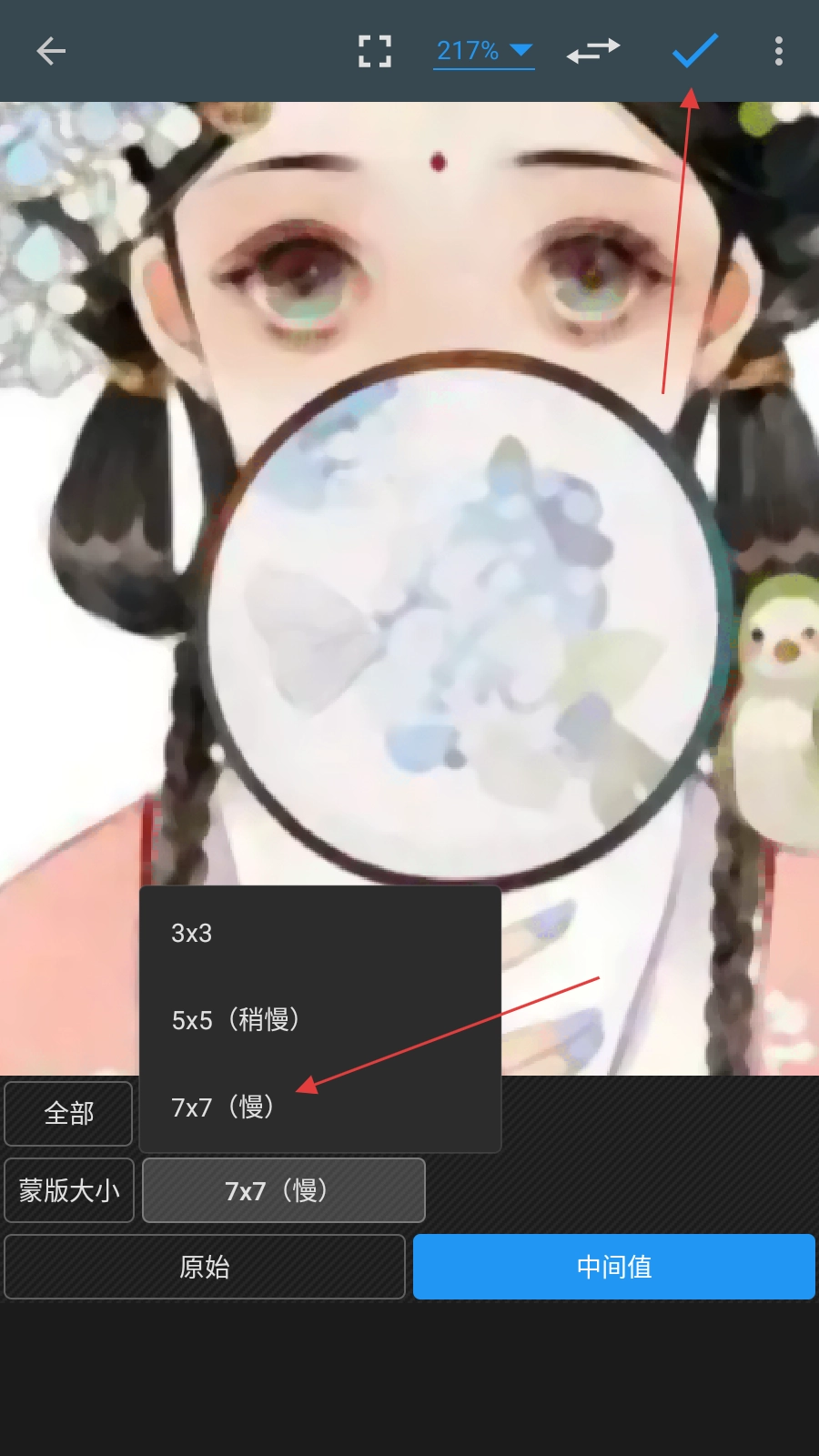 4、在降噪选项中,选择【7x7(慢)】后点击【确认】图标,即可看到图片的马赛克被优化去除。