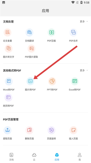 2、在应用板块中,找到【图片转PDF】功能并点击,进入图片选择界面。