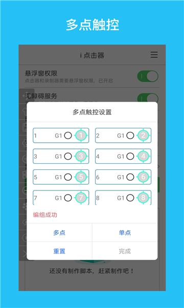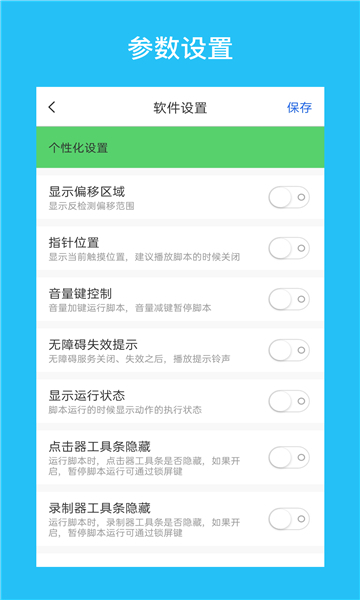 个性化功能支持:支持标记偏移区域点击显示、指针位置显示、工具条隐藏、点击器工具条定制、多脚本悬浮运行、脚本合并、多脚本悬浮单脚本运行、多脚本悬浮顺序运行、长按删除动作以及脚本分享导入。