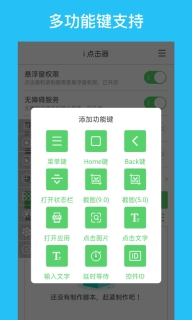 功能动作包含:菜单键、Home键、Back键、打开状态栏、分屏切换、截图、三指截图、切换或打开应用、识图点击、识色点击、点击文字(支持Android原生文字与网页文字)、输入文字、延时等待动作、依据控件ID点击。
