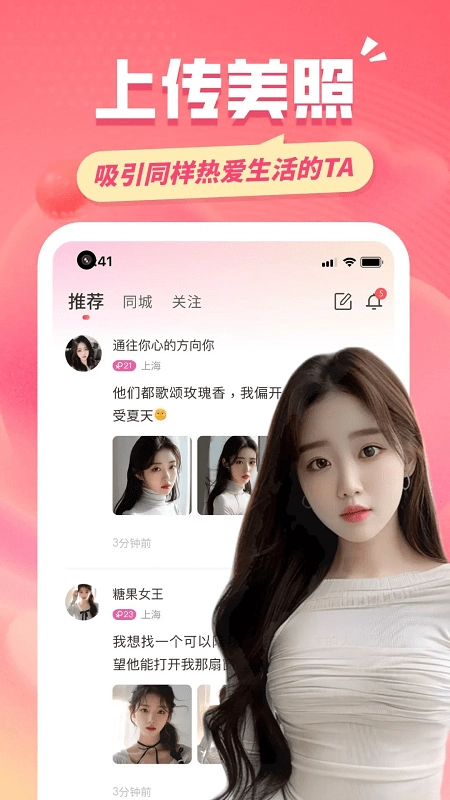 同城约友最新版是可以实现大量陌生交友的平台,只为搜寻附近的ta,精准定位,为您找到附近500米爱聊天,爱视频,灵魂合一且对的ta。1对1私密灵魂聊天,让陌生人变成您的灵魂伴侣,视频/图片/文字的聊天方式拉进您与ta心灵的距离。