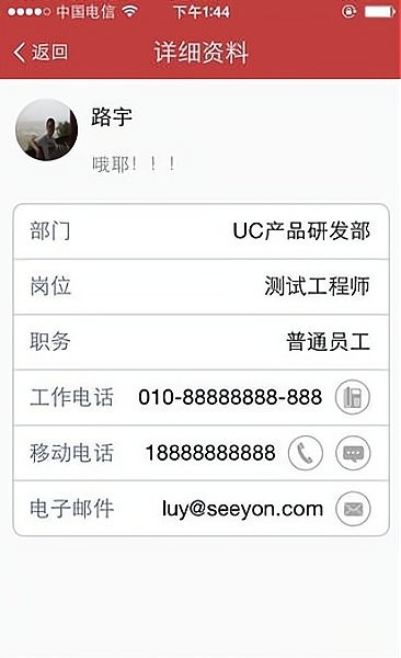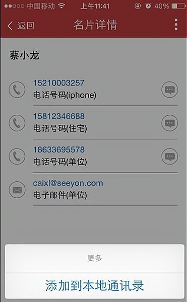 3、通讯录:无需再把同事的电话号码全部存到手机通讯录里了。