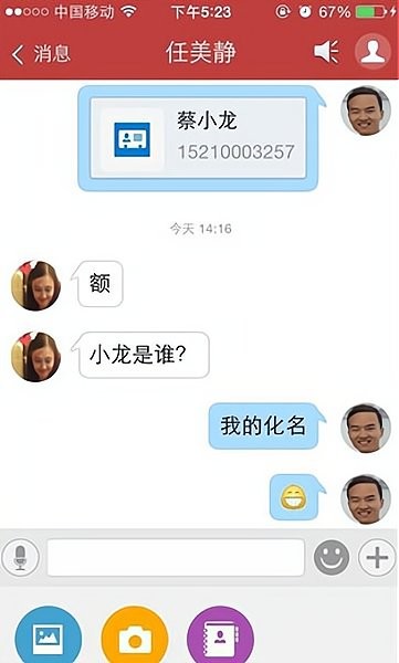 1支持多种信息传递形式,包括输入文字、选择表情符号、录制语音消息、上传图片文件、实时拍摄照片,以及分享手机本地存储的联系人信息等。