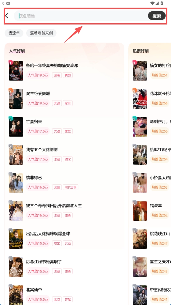 2、在搜索页面,能选搜索词和榜单标签,查看人气与热搜剧集。