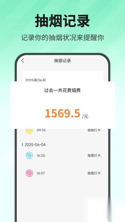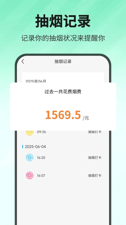 有一款专为烟民或戒烟人群设计的手机应用,能辅助用户记录日常吸烟情况。使用者只需轻点按钮,就能把每一次吸烟行为记录下来,应用会自动汇总每日、每周和每月的吸烟数量,并输出包含详细信息的数据总结。