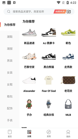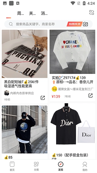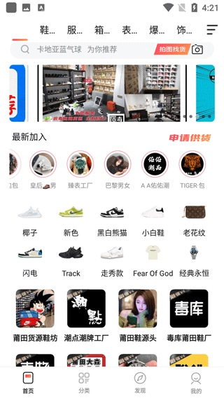 3、点击发现,在这里可以看到最新上架的衣物,并且可以拍图找货。