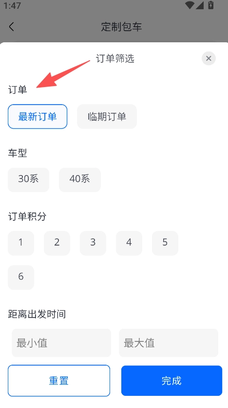 2、在定制包车板块,筛选订单后点击完成按钮即可完成筛选操作。