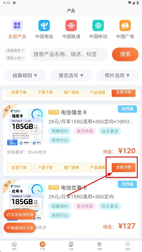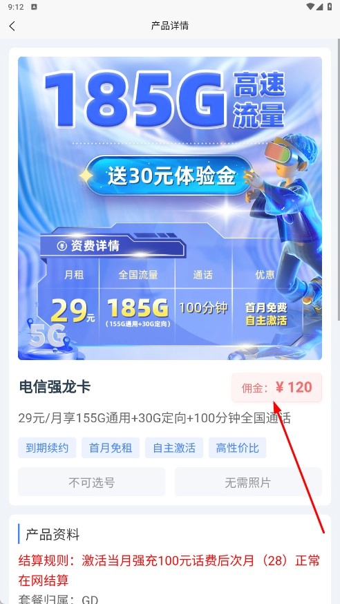 3、进入产品详情页面后,能够查看产品的佣金、资费等相关信息,例如【电信强龙卡-产品名称】的佣金数额以及套餐具体内容。