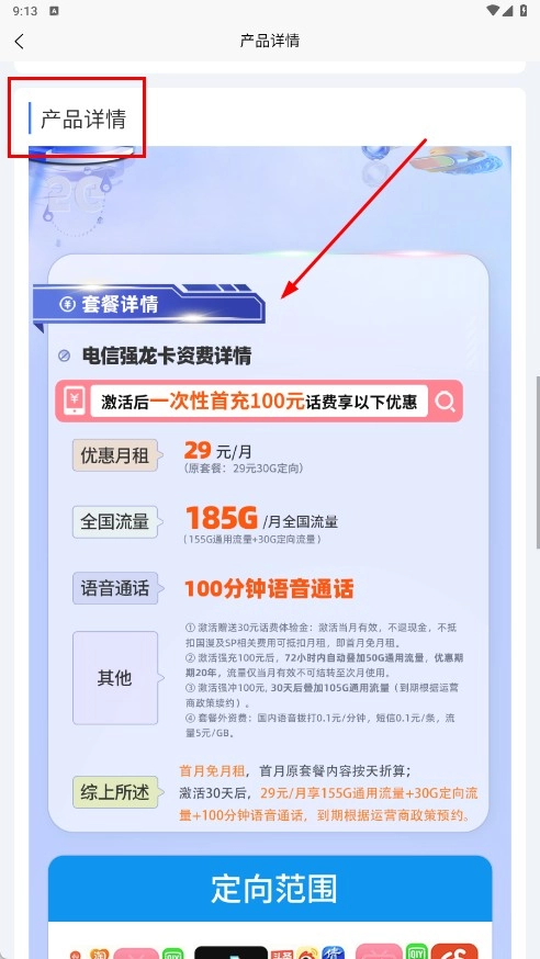 4、进入产品详情页后,可通过查看【套餐详情-模块】,了解流量、通话时长等具体的资费内容。