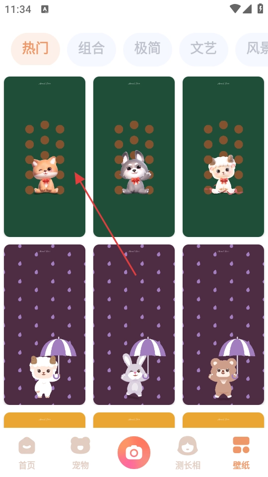 进入壁纸界面后,你可以在热门、组合等分类里挑选心仪的宠物壁纸,比如带有圆点背景的狐狸壁纸。