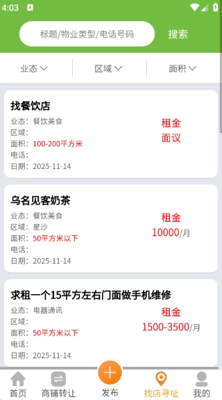 3. 整合了各类租售信息,用户能在单一平台内完成不同类型店铺的搜索与发布等操作,十分便捷。