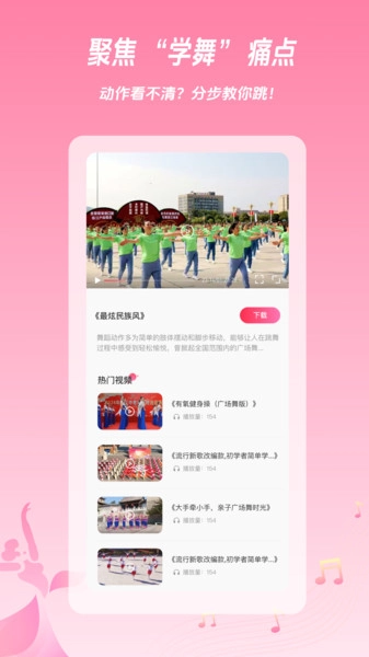 1、提供热门且全面的广场舞教学视频,具备动作分解与节奏把控功能,适合零基础人群快速入门。